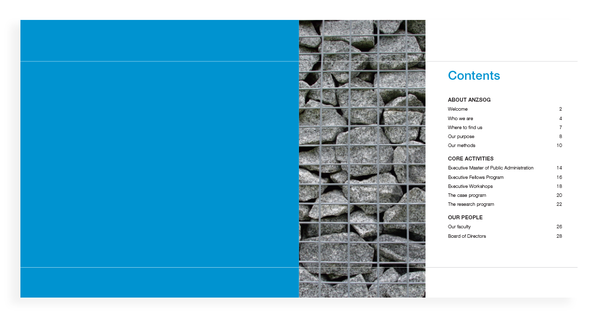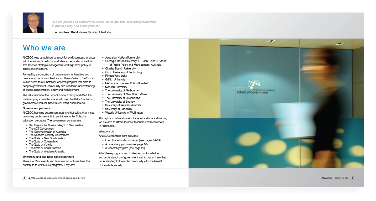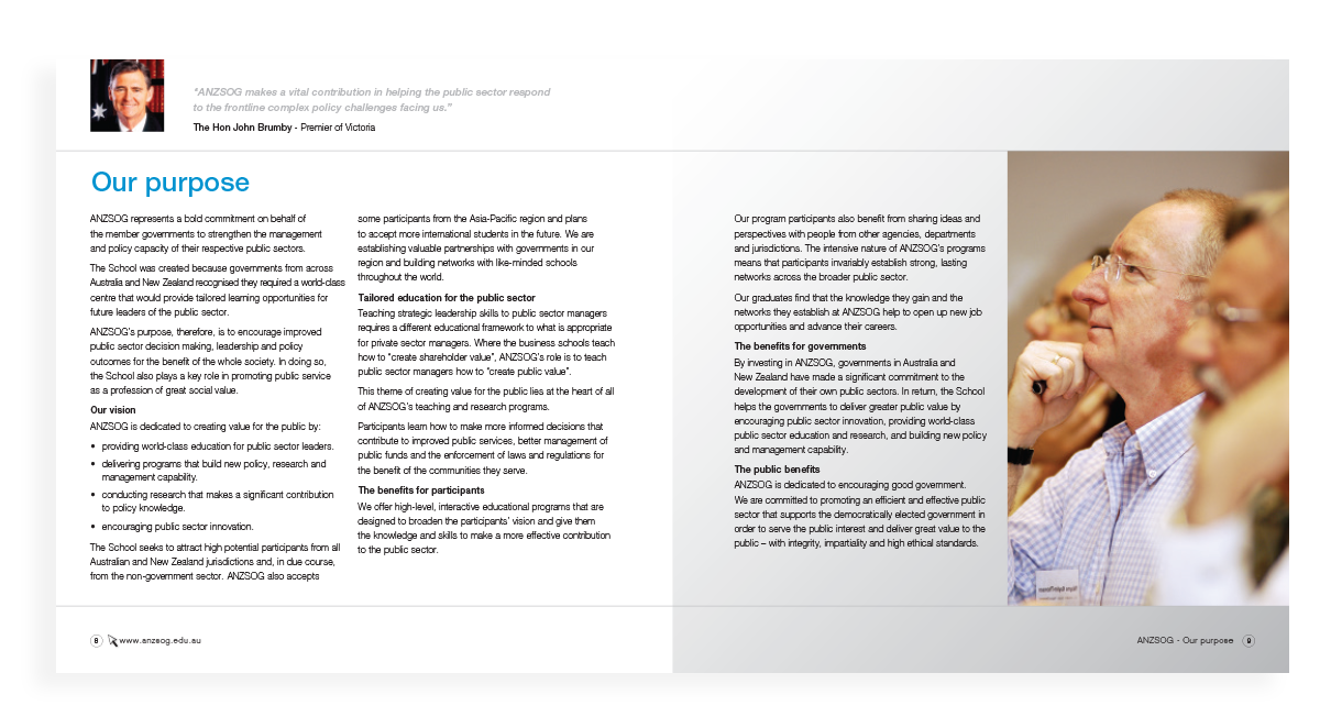 Australia New Zealand School of Government teaches the politicians and public servants of tomorrow. The brief was to create a booklet that showed the work ANZSOG does. A bit like an annual report minus the report part...