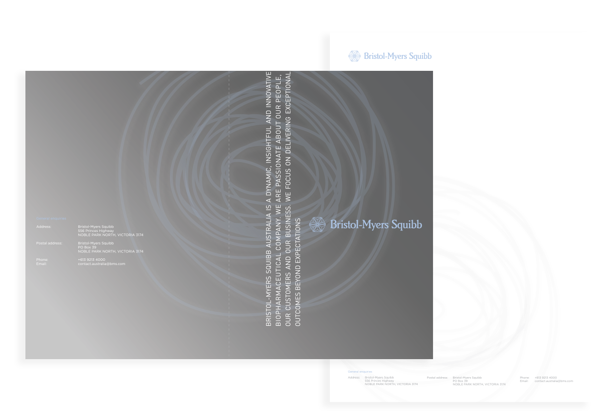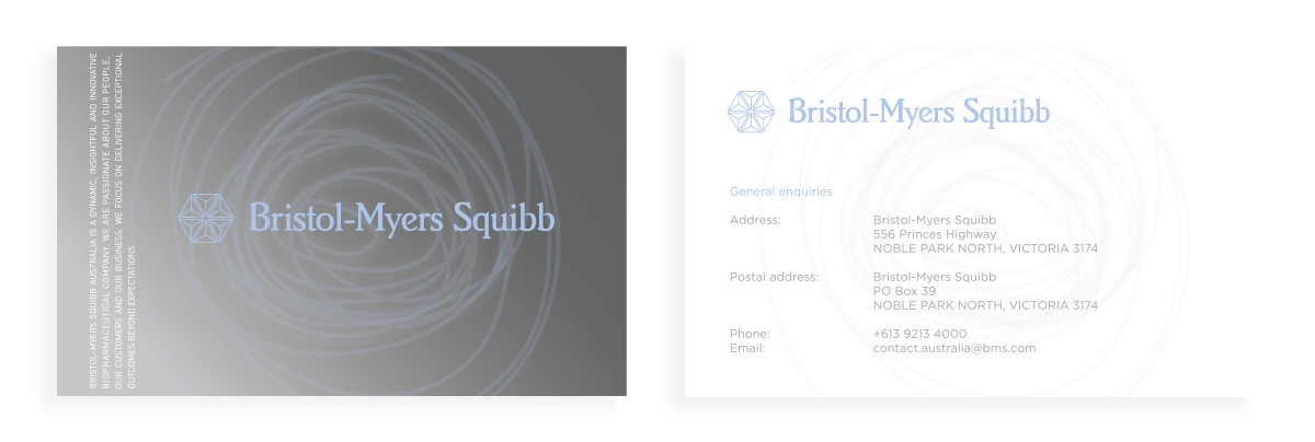 The brief for the Bristol-Myers Squibb stationary was quite a simple one. Keep it subtle, include their mission statement and use a generic pattern. This is what I came up with. Both the folder and business card front use a varnish over the squiggly line bit...