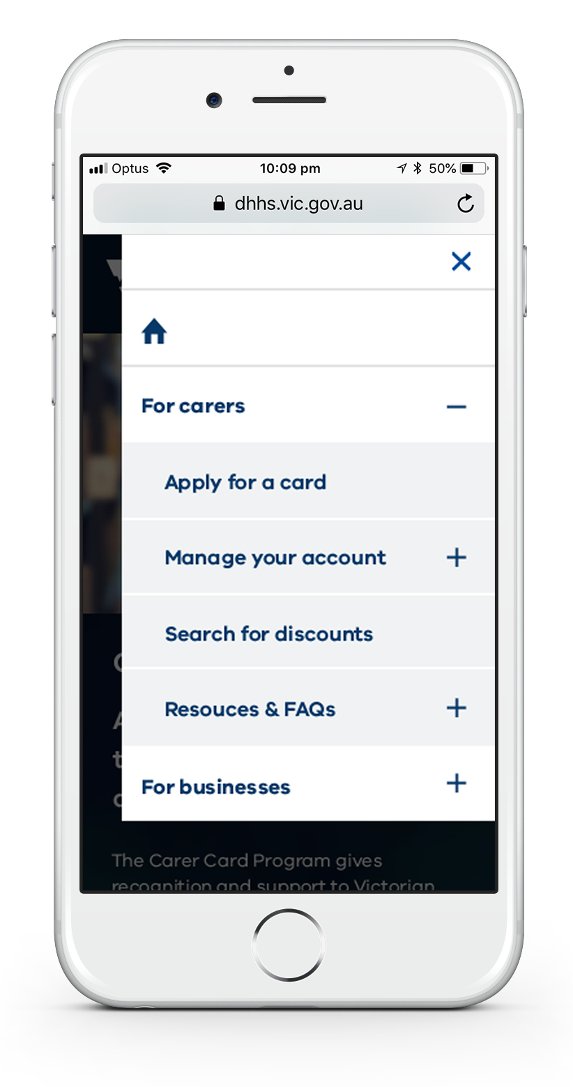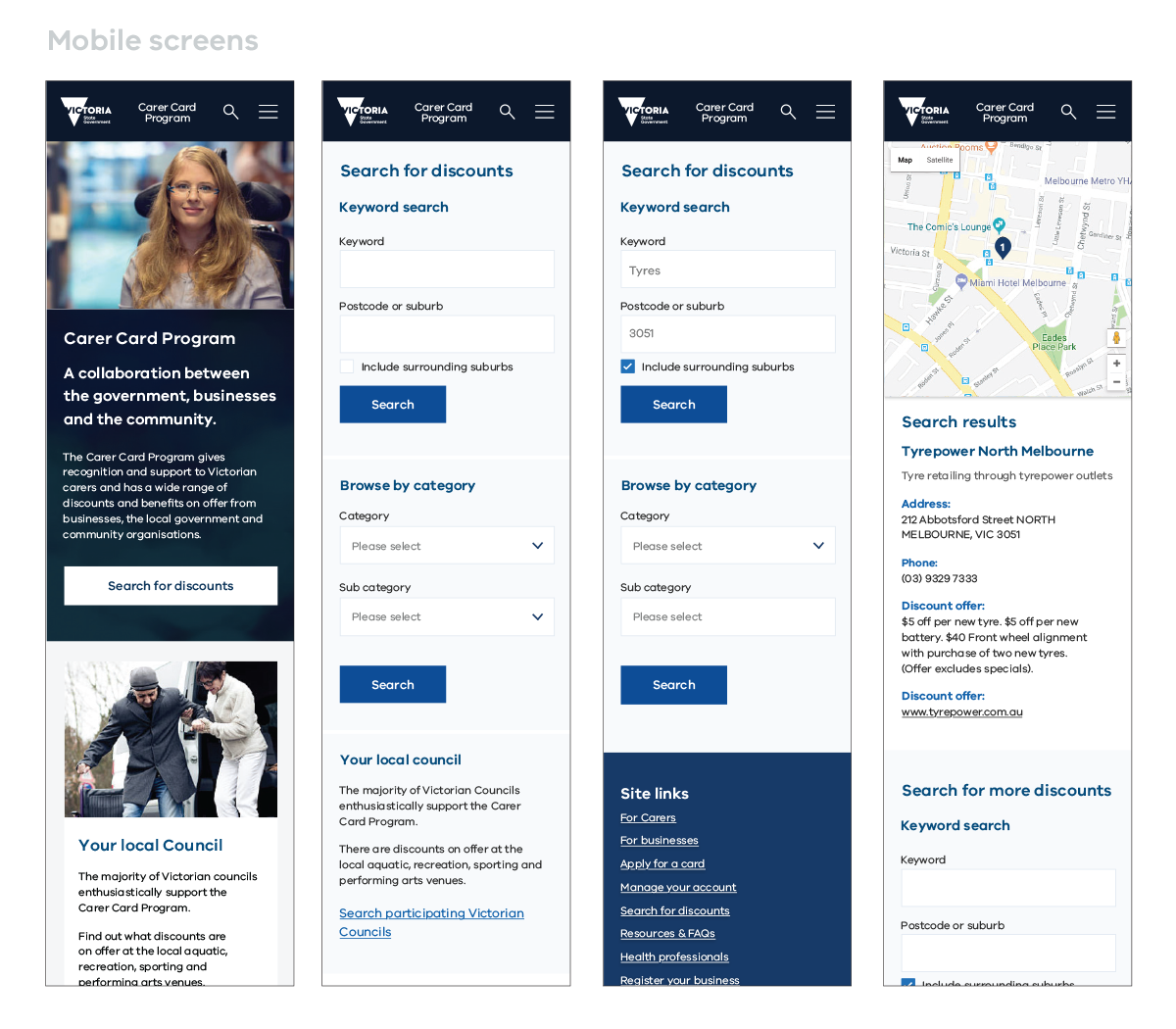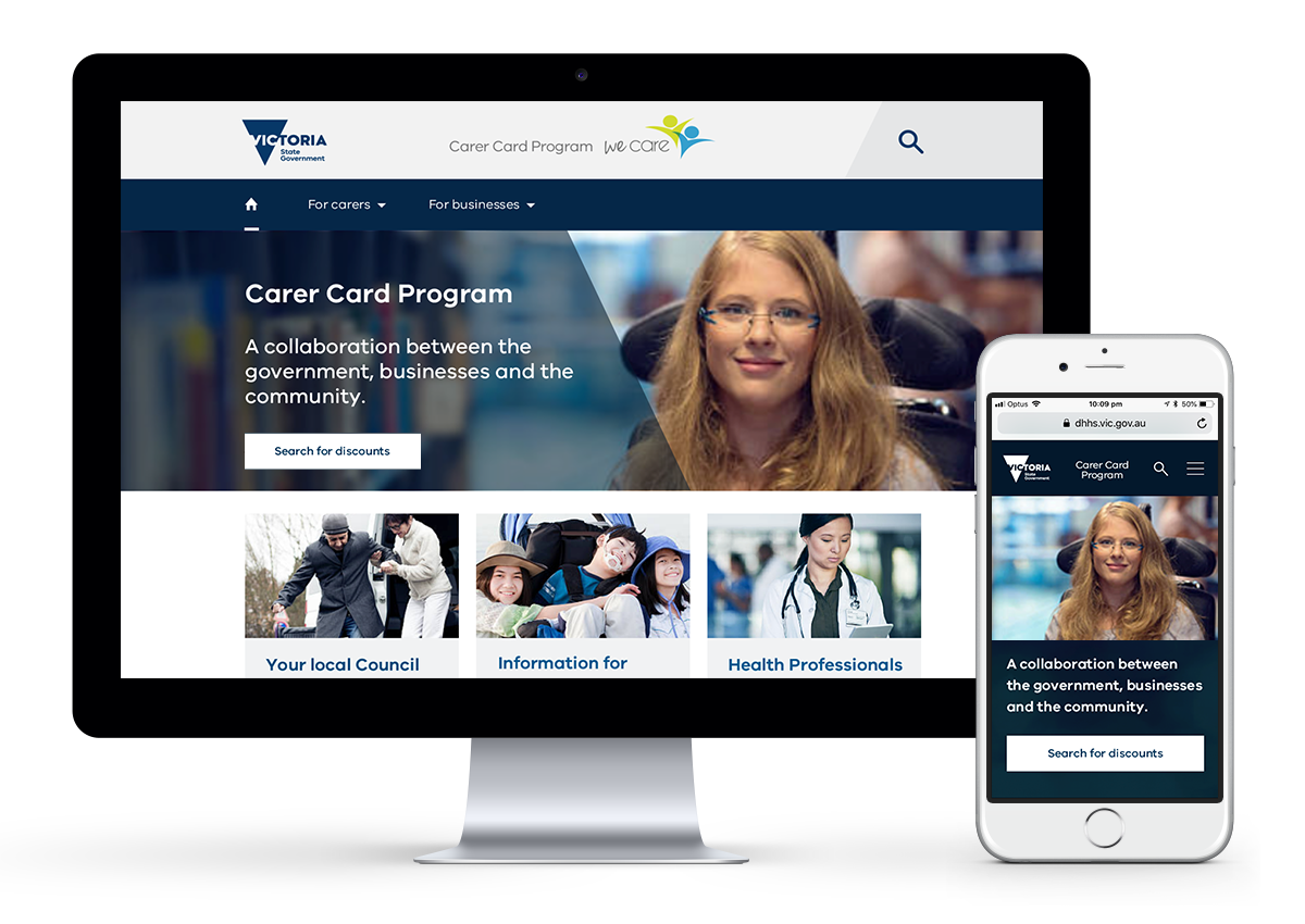There seemed to be a clear objective when coming to the site and you were either a carer or a business so this was the first decision when it came to simplifying the navigation. Another major pain point was the 3 navigation bars and understanding the terms and definitions. The process of finding local businesses that offered discounts and applying online for a Carer Card also highlighted some frustrations that needed to be addressed.