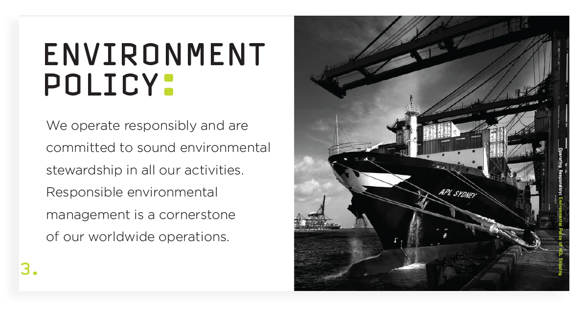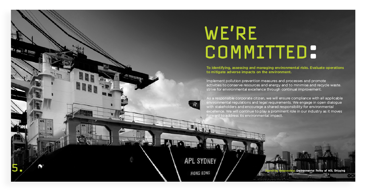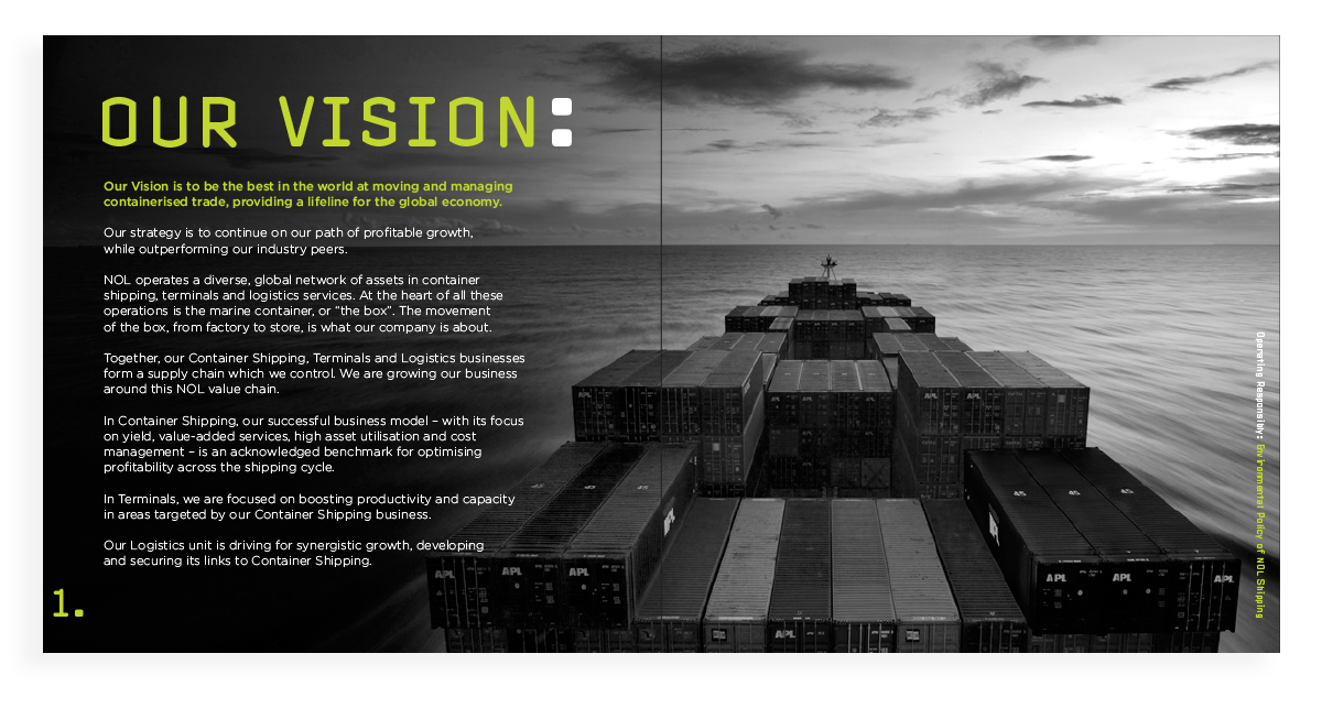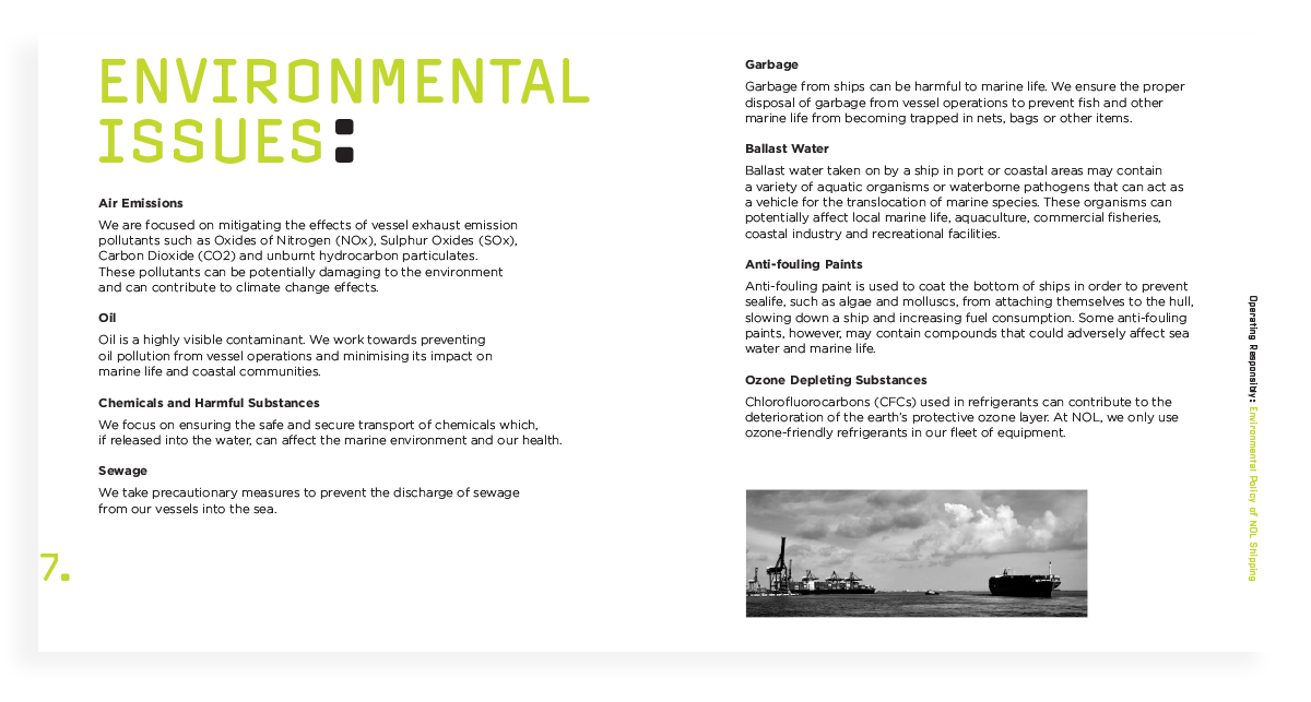 Neptune Orient Lines is the third biggest shipping company in the world. Singapore based, the company prides itself on its high standards of maintenance of its shipping fleet. This booklet was used to show the companies up-front policy about the ships impact on the environment.