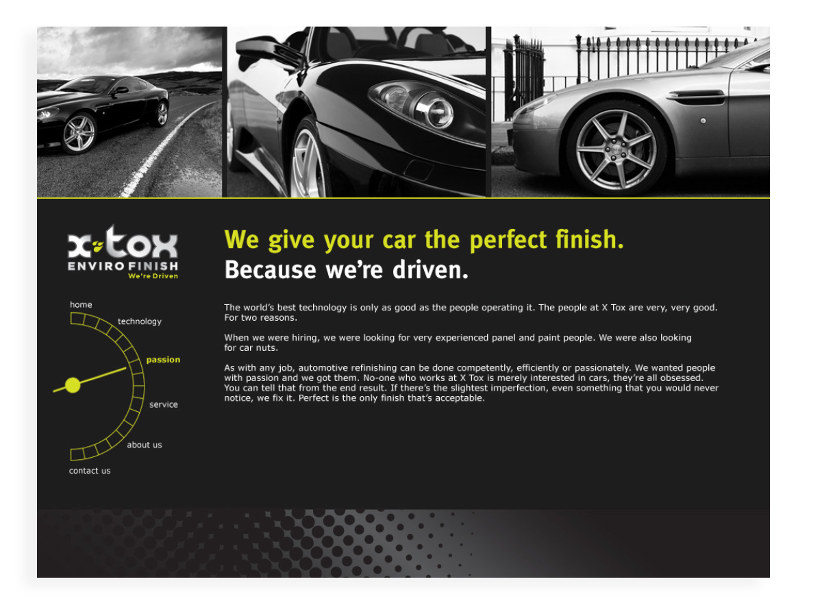 XTox is a new, high end paint and panel repair shop for sports car nuts that care about the environment. The paint technology they use is all 100% eco-friendly as it’s water-based. When you go to their website, the buttons make the speedo jump like it’s revving.